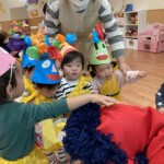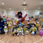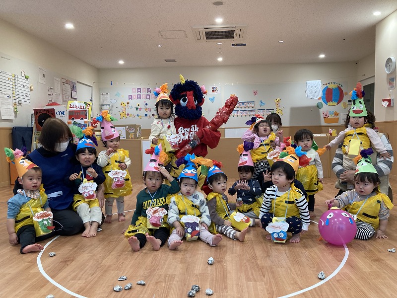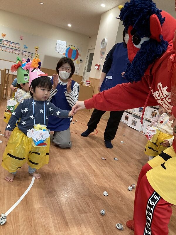 今年も節分の日に鬼のコスチュームを身に着けて豆まきの練習をしていると、突然赤鬼さんがスマイル保育園にやって来ました。