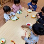お待ちかねのプレゼントタイム。ひとりひとり手渡しで絵本を配ってくれたほか、「みんなで仲良く遊ぶように」と、キラキラ光るひもとおし・・・・・のオモチャもプレゼントしてくれました。みんな夢中になって遊んでいます。