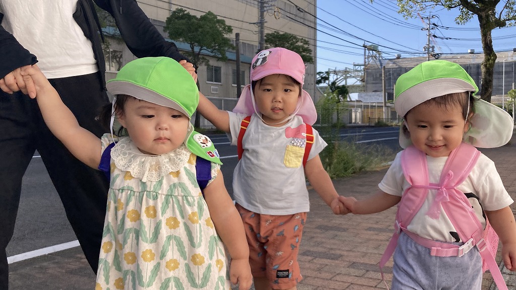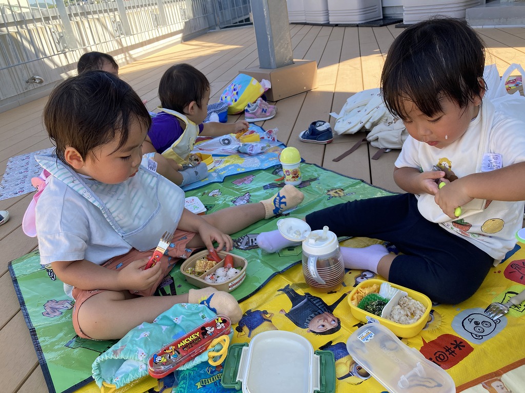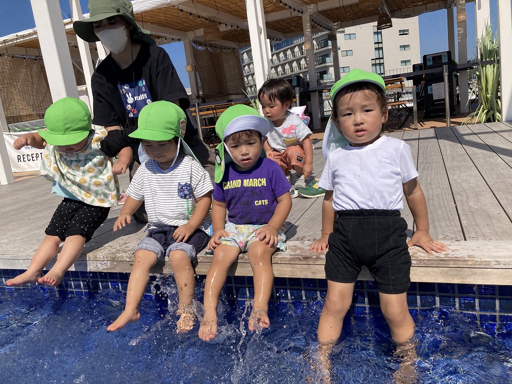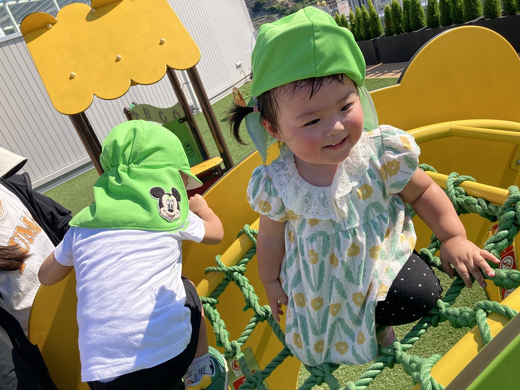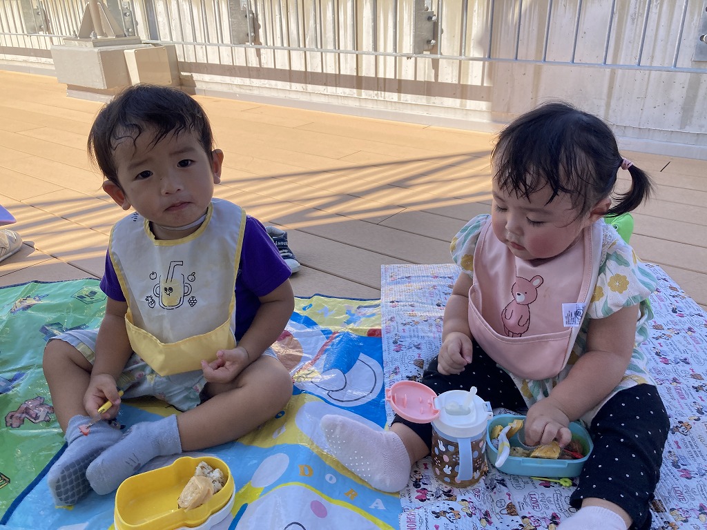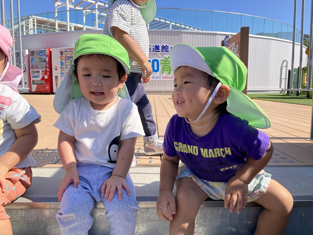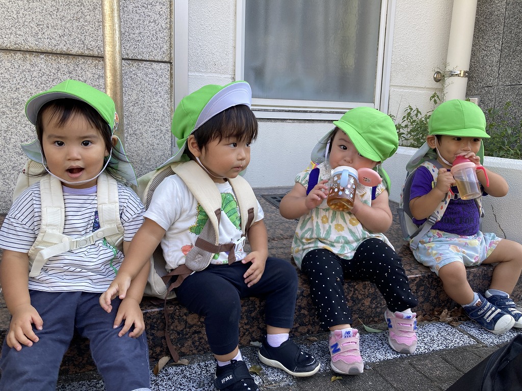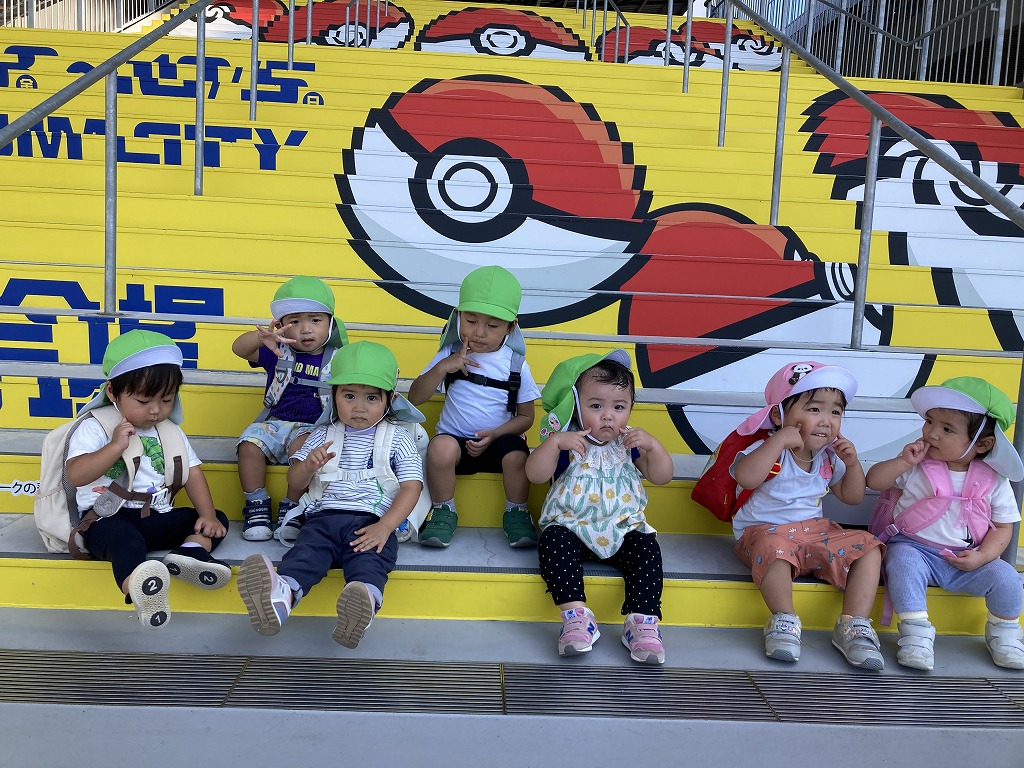 さくら組・すみれ組で遠足に行ってきました。今回は0歳児クラスのもも組はお留守番です。 「いってきまーす!!」と元気に手を振って保育園からスタジアムシティまで約1.9キロの道のりを1歳と2歳で歩き切りました☺ スタジアムシティでは遊具で遊んだり、足湯を楽しんだり☺お楽しみのパパとママが作ってくれたお弁当を食べて帰って来ました。 大満足の子どもたちでした。まだまだ日差しは暑かったけれど子どもたちは大ハッスルでした☺