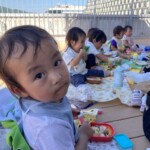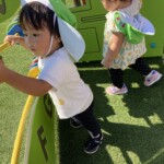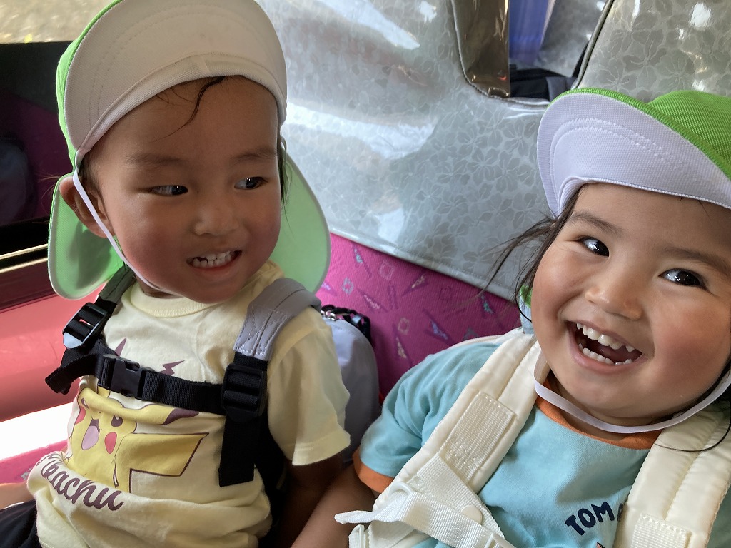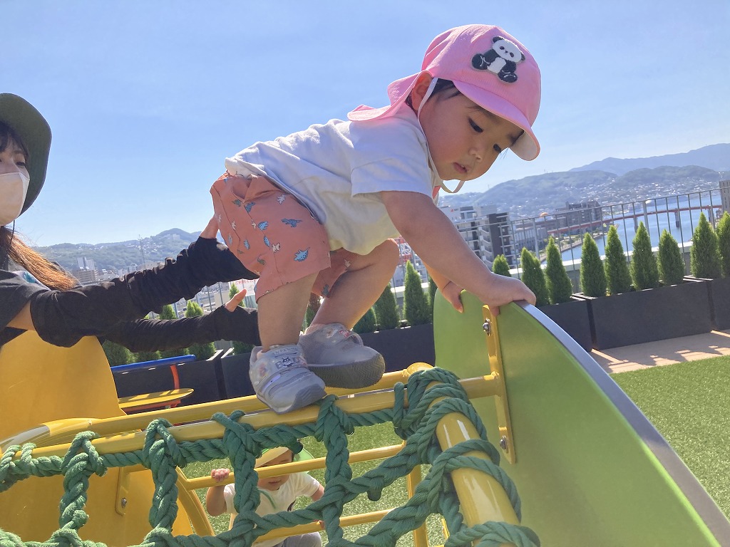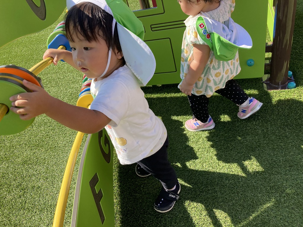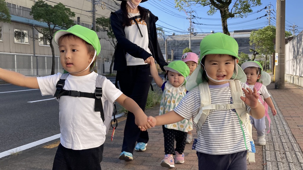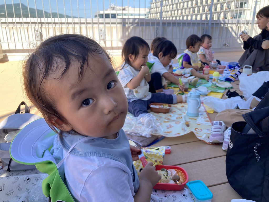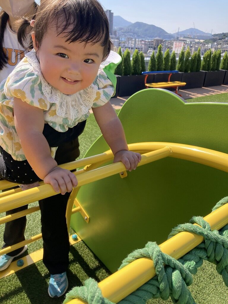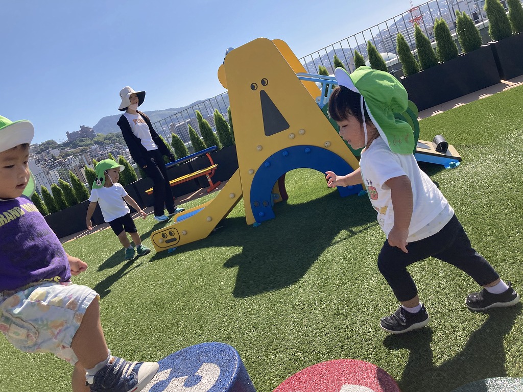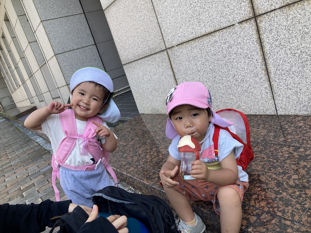 さくら組・すみれ組で遠足に行ってきました。今回は0歳児クラスのもも組はお留守番です。 「いってきまーす!!」と元気に手を振って保育園からスタジアムシティまで約1.9キロの道のりを1歳と2歳で歩き切りました☺ スタジアムシティでは遊具で遊んだり、足湯を楽しんだり☺お楽しみのパパとママが作ってくれたお弁当を食べて帰って来ました。 大満足の子どもたちでした。まだまだ日差しは暑かったけれど子どもたちは大ハッスルでした☺