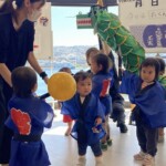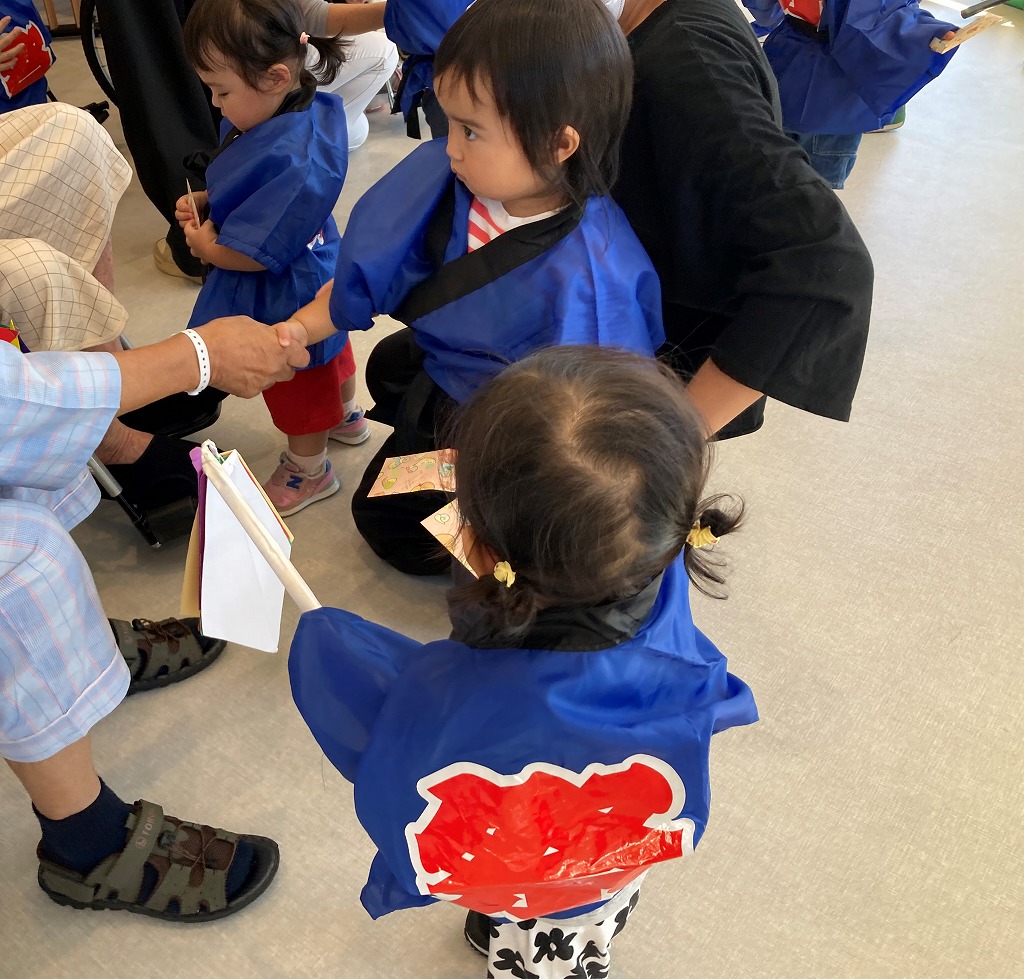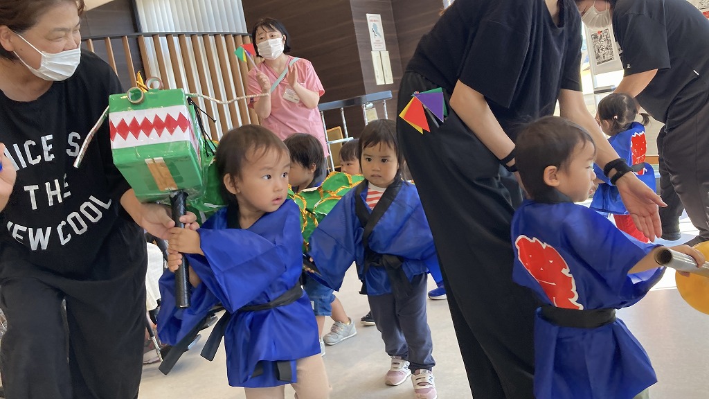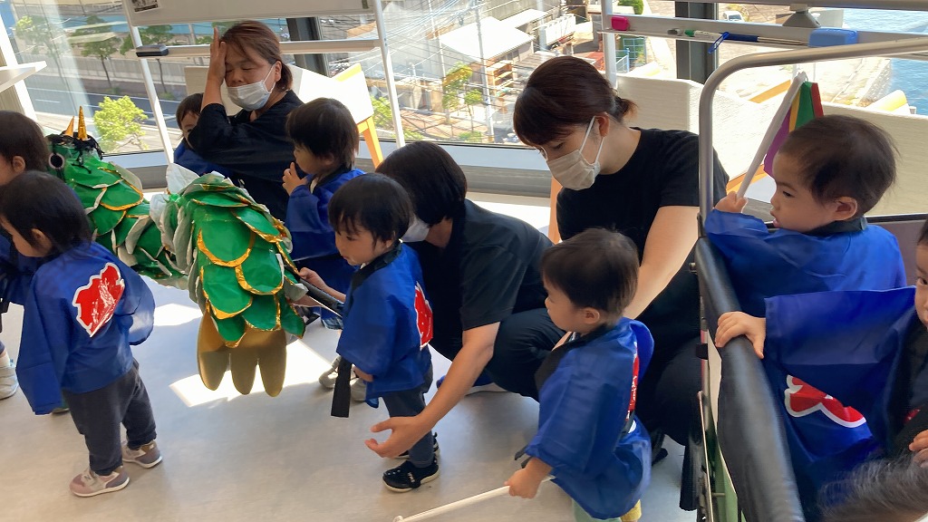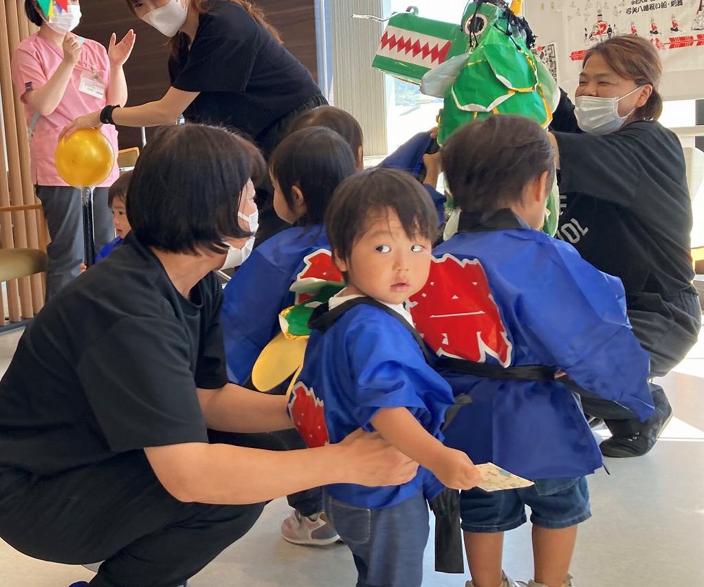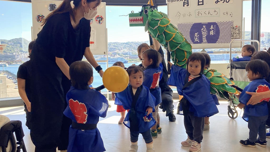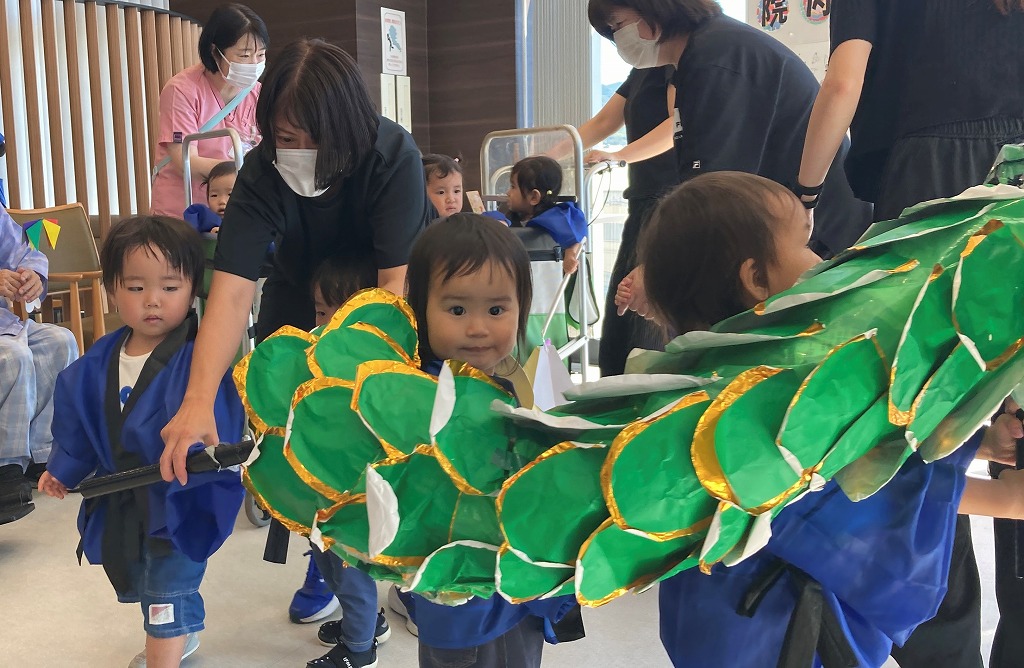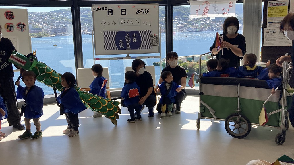 スマイル保育園でも可愛い龍と一緒に、龍踊りを病院の患者さんたちに披露しました!おくんち恒例の「御花」も頂き子どもたちは大喜び!!「もってこ~い」の掛け声に張り切ってもうひと踊りして帰って来ました。